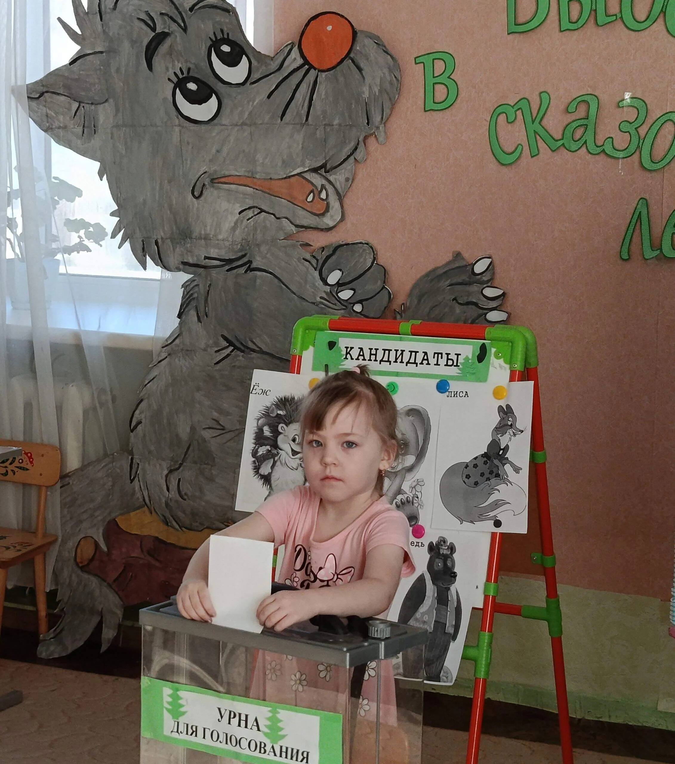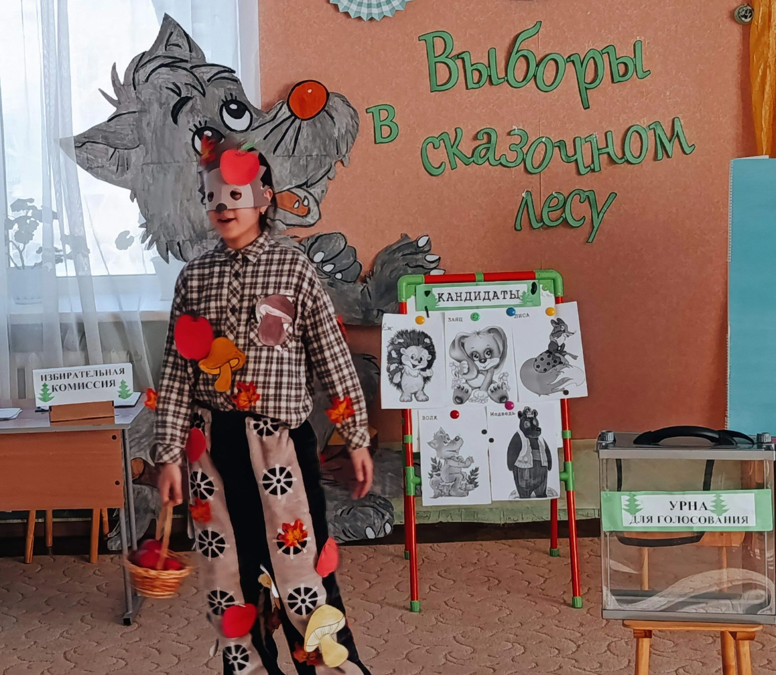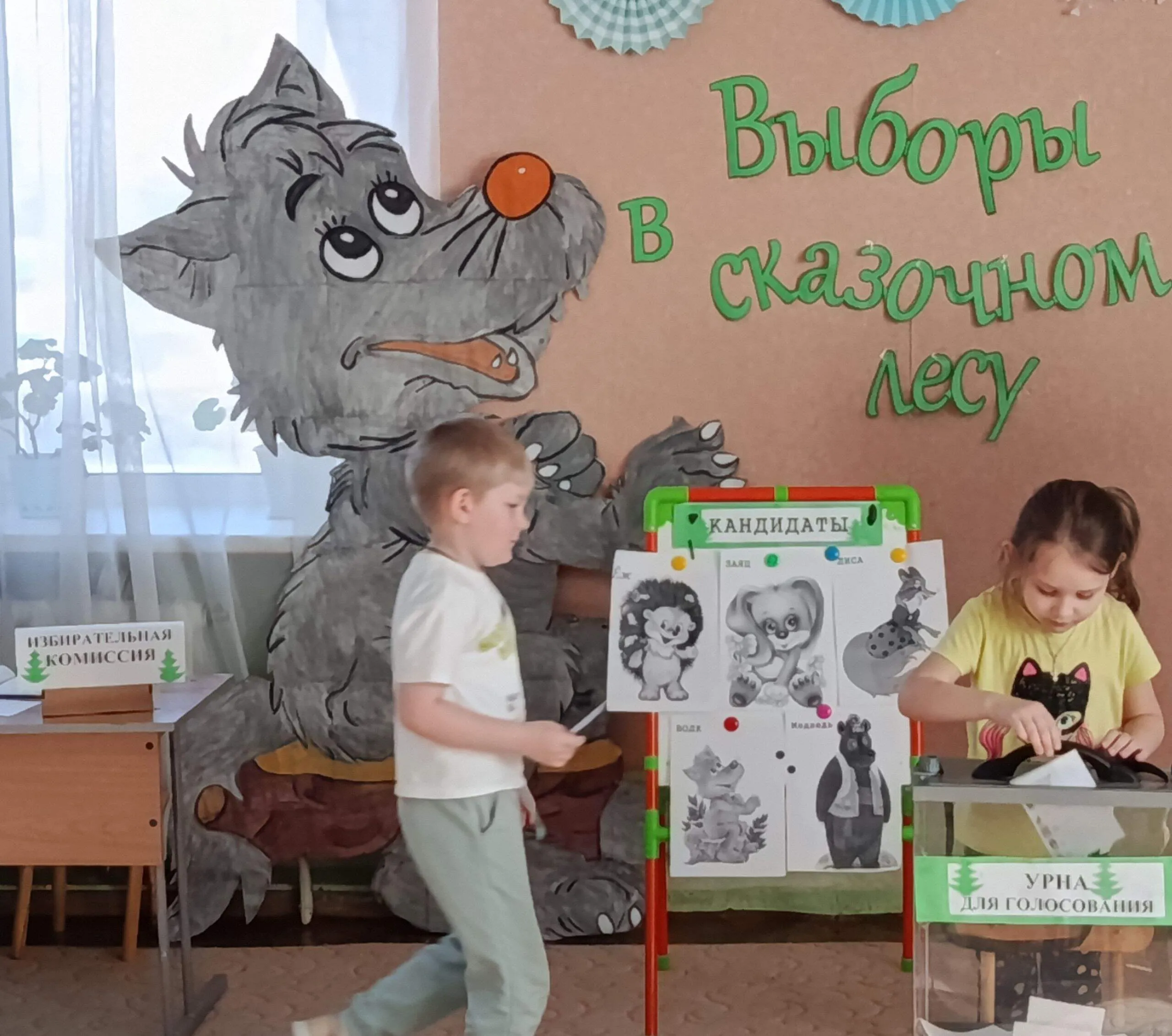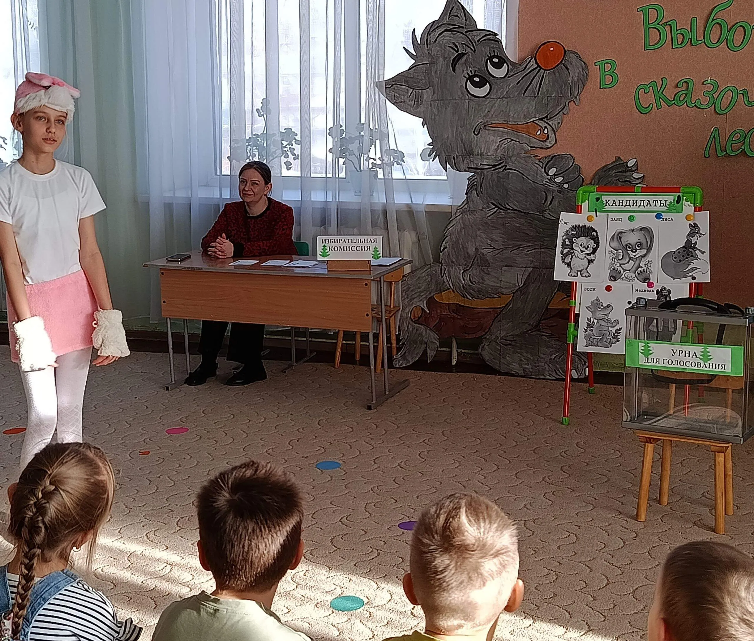 Библиотекарь предложила детям побывать на выборах в сказочном лесу, где звери решили выбрать его Правителя. Претендовали на это место пять кандидатов: медведь, волк, лиса, заяц и ёж. Детям нужно было выбрать самого достойного, прослушав предвыборные обещания каждого из них.